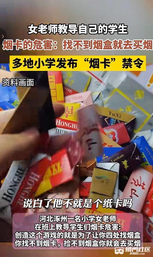 今天刷抖音看见了我就问了下儿子他有没有烟卡,结果他翻书包拿出一了张黄鹤楼的烟卡,因为我平时不抽烟问他哪里来的他说同学给的,我看了下他的书包确实就一张!这个烟卡就是烟盒最上面的盖子撕下来叠成一个长方形的卡片,我跟他说了危害还是感觉禁止这个东西单靠家长也做不到毕竟这是个群体行为,真不知道这个东西咋做到全国传播的!